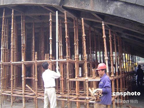 因小商品摊位发生火灾导致南京长江大桥南引桥第一桥孔受损严重,有关方面正组织力量抓紧抢修加固,工程完成需时二个多月。中新社发 王国安 摄