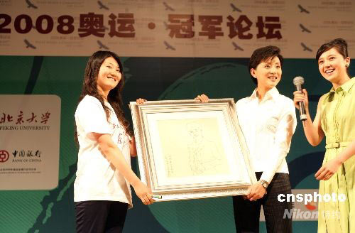 图:杨澜接受北京大学赠送的“杨澜画像”
