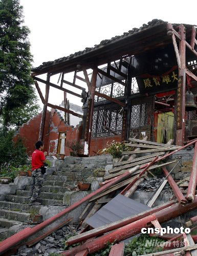 六月四日,一名香客在四川绵竹的云悟寺上香。位于四川绵竹的云悟寺,始建于明代嘉靖年间,目前的云悟寺为一九四三年重修,是巴蜀知名度很高的佛寺。此次大地震造成寺内主体建筑完全垮塌,损失惨重。中新社发 慎重 摄