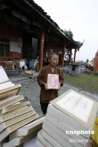 图:尼姑从垮塌的大殿中抢救出的经书