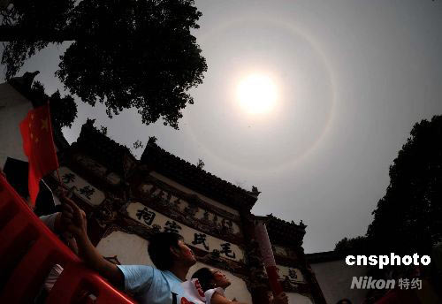 6月5日,奥运圣火湖南传递在韶山结束后,天空出现日晕奇观,毛氏宗祠前为圣火欢呼的人们仰望奇观。 中新社发 廖攀 摄