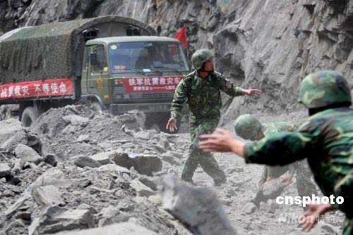 6月5日,铁军救灾物资运输队的车队穿过险象环生的塌方路段向理县藏、羌族居住的高原山寨运送救灾物资。汶川地震灾区阿坝藏族、羌族自治州理县是藏、羌民族居住地,全县13个乡寨均分布在高原山寨等偏远地区,由于震后余震不断飞沙走石过往道路十分艰险。从县城通往各乡寨的道路成为灾区远近闻名的“死亡之路”。村民被困其中,救灾物资难以到达,受灾群众和当地政府心急如焚。在此参加抗震救灾的铁军炮兵团官兵闻讯后,迅速成立了一支由24名优秀党员组成的“突击队”——铁军救灾物资运输队。担负起全县13个乡的救灾物资运输工作。最近的乡蒲溪乡距县城25公里海拔2000多米,是道路最危险的乡,飞石塌方险象环生光塌方路段就有10多公里,来回需要五、六个小时。
