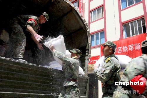 铁军救灾物资运输队的车队向理县藏、羌族居住的高原山寨运送救灾物资。中新社发 曾宪平 摄