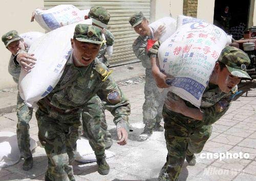 铁军救灾物资运输队的车队将救灾物资送达理县藏、羌族居住的高原山寨。中新社发 曾宪平 摄