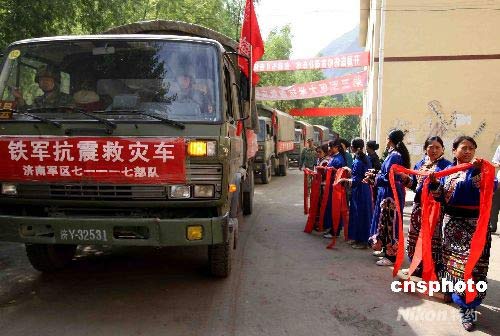 羌族民众手捧象征平安的红绸迎接车队。中新社发 曾宪平 摄