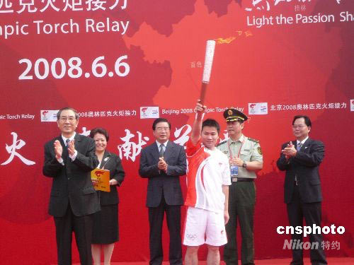 六月六日上午九时,广西桂林市国际会展中心广场,奥运圣火传递活动举行了简短而庄重的起跑仪式。全体人员向四川地震遇难同胞默哀一分钟。九时十五分,前奥运会举重冠军唐灵生从广西壮族自治区主席马飚手中接过“祥云”火炬,开始了圣火在桂林市的传递。 中新社发 周利朔 摄