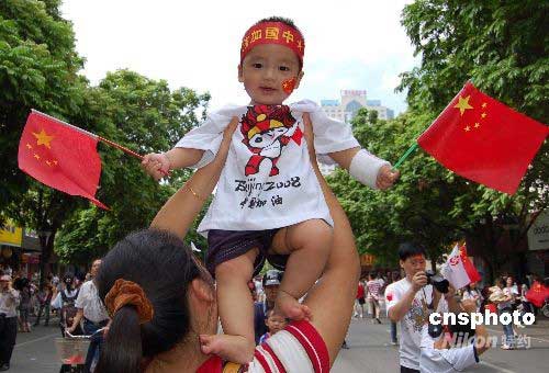 6月7日,北京奥运火炬在广西南宁传递,当地民众热情似火喜迎圣火。中新社发 刘万强 摄