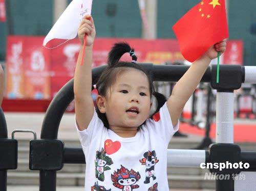 广西南宁一位小朋友在民族广场为即将到来的奥运火炬欢呼。中新社发 刘万强 摄
