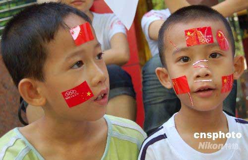 两名脸上贴着国旗图案的少年在迎接奥运圣火的到来。中新社发 刘万强 摄