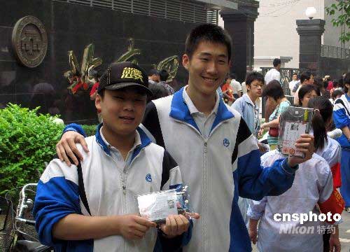 6月7日上午,“北京市2008年普通高等学校招生全国统一考试”第一天,地处北京西皇城根的京城名校北京四中考点门前,考生宁硕硕(左)一早便和同学汇聚,等待进入考场。中新社发 邹宪 摄