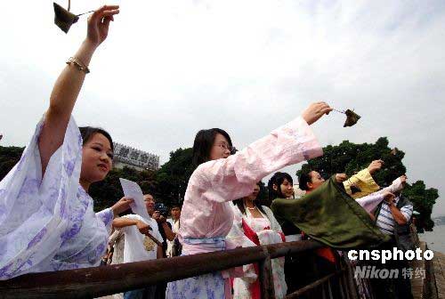 众多身着传统汉服的福建青年女子纷纷向闽江投粽子,端午时节祭悼屈原。中新社发 刘可耕 摄