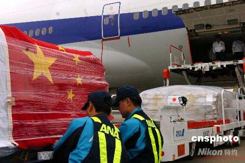 图为机场工作人员正在往飞机上装载救援物资。中新社发 朱沿华 摄