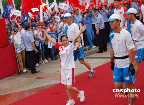 6月8日上午,北京奥运火炬在革命老区广西百色平果县进行传递,第一棒火炬手是平果县希望小学校长、壮族姑娘周标亮,她曾受到邓小平的资助。上世纪九十年代,邓小平以“一个老共产党员”的名义向希望工程捐款5000元,这笔捐款被落实到平果县希望小学,使25名濒临失学的贫困学生得以继续学业,周标亮就是当年得到资助的学生之一。后来,这位壮族姑娘考取了一所师范学校,毕业后她回到培养自己的平果县希望小学任教,2005年被任命为该校校长。中新社发 刘万强 摄