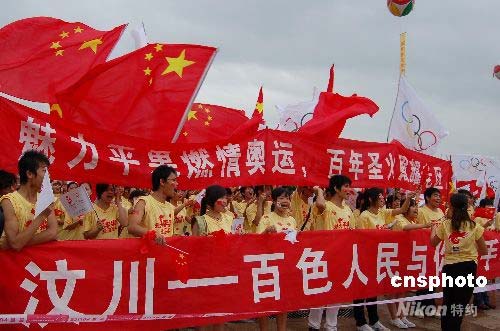当地民众热情迎接圣火,并打出支持四川汶川地震灾区人民的横幅。中新社发 刘万强 摄