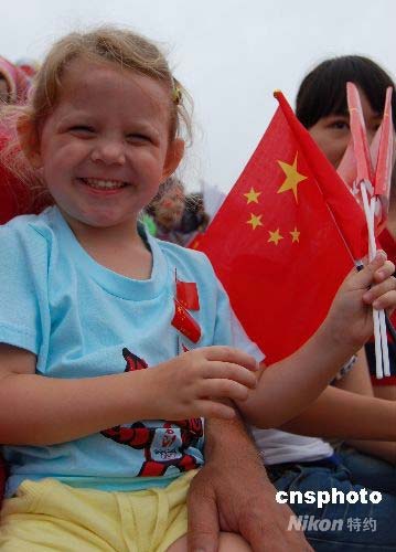 图:外国小朋友在广西百色热情迎接奥运圣火
