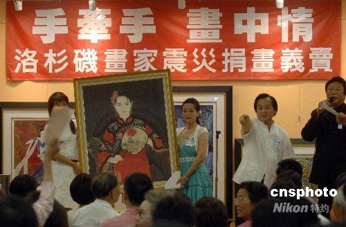 当地时间六月七日下午,洛杉矶地区旅美画家赈灾捐画义卖活动在阿罕布拉市举行,近百名旅美画家为中国地震灾区捐献了数百幅作品,当地数百名艺术品收藏家和爱好者参加了义卖活动。最终,百分之九十以上的画作被成功拍卖,总成交约二十万美元。中新社发 张炜 摄