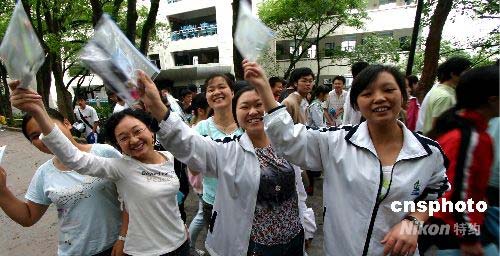 6月7日,走出考场的兴奋的考生。重庆市永川区的6513名高考考生经过两个半小时的语文答题,11:30轻松步出考场。中新社发 陈仕川 摄