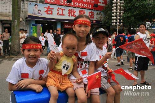 图为一家姐弟四人手举五星红旗迎接奥运圣火。 中新社发 周兆军 摄