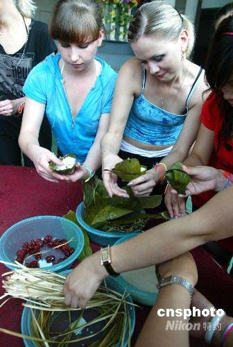 6月8日,在端午节来临之际,北京世界公园组织中外宾客学包粽子,通过端午节的物质载体——粽子,认识中国传统节日的文化内涵。中新社发 富田 摄