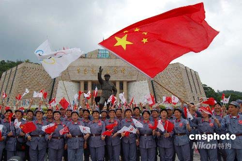 6月8日下午,奥运圣火在广西百色市传递,当地民众在百色起义纪念馆高举国旗和五环旗欢迎圣火。百色是邓小平军事生涯的起点,一九二九年邓小平在百色领导发动了著名的百色起义。中新社发 刘万强 摄