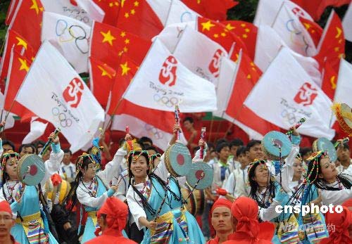 6月9日,奥运圣火开始在中国少数民族聚集地云南省开始传递,在昆明举行的起跑仪式上藏族少女等少数民族青年载歌载舞欢庆圣火到来。 中新社发 廖攀 摄