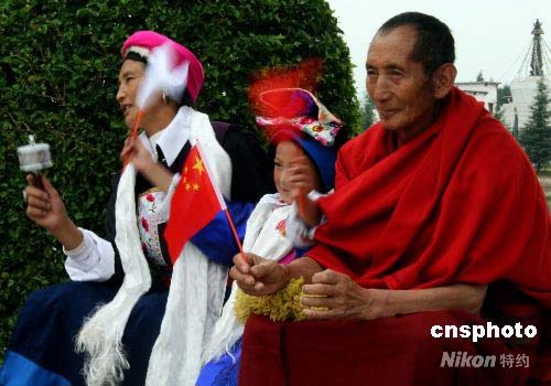 在云南民族村里一名喇嘛和两名藏族同胞一起等待圣火到来。 中新社发 廖攀 摄