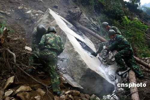 6月8日,中国空降兵某部进村入户之后,在四川省什邡市蓥华镇清理通往麻柳坪盘山公路上的滑坡,帮助当地石门村恢复交通。图为官兵在麻柳坪盘山公路上清理滑坡碎石。 中新社发 谭超 摄