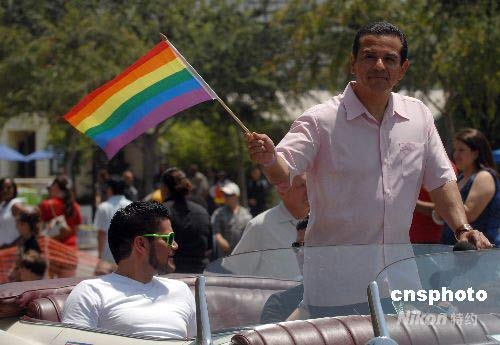 洛杉矶市长维拉莱格萨挥舞彩虹旗参加同性恋者大游行,以示支持。中新社发 张炜 摄