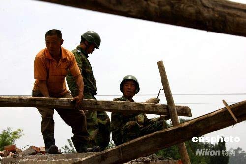 6月8日,中国空降兵某部“常胜模范连”所在团官兵,进村入户之后,在四川省什邡市蓥华镇帮助受灾群众清理废墟,搭建临时过渡房。中新社发 谭超 摄