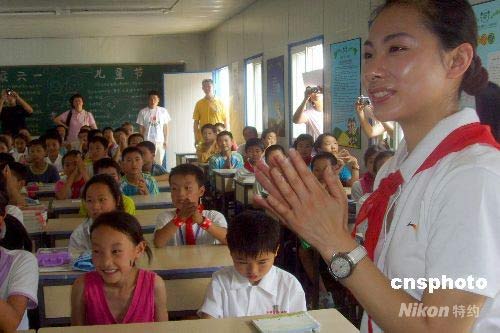 6月9日下午,奥运冠军李宁、刘璇、杨凌及体操世界冠军李春阳等来到位于四川省绵阳的八一帐篷学校,探望灾区的孩子。图为刘璇和孩子们一起上音乐课。 中新社发 霍潺 摄