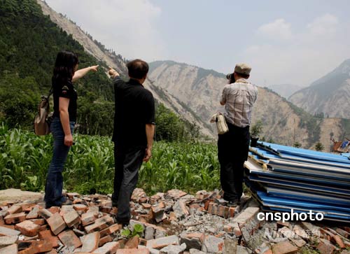 失事直升机残骸10日晨在四川汶川映秀镇3511高地(当地村民称“火烧杠”)被发现,图为记者遥望四川省军区司令员率部赶赴的山头。中新社发 贾国荣 摄