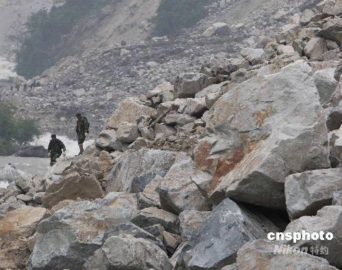 参加搜救的四川省军区部队继续增援山高林密非常险峻的失事地点,准备运送遗体。中新社发 贾国荣 摄