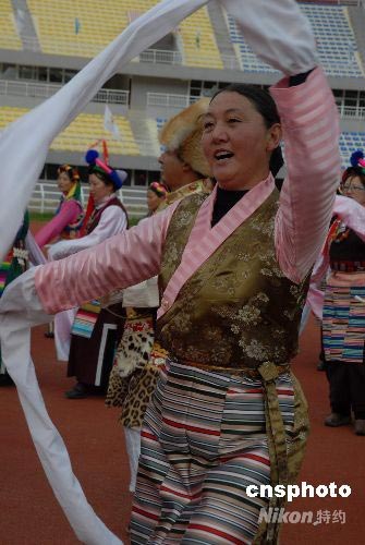图:藏族群众载歌载舞欢迎奥运圣火