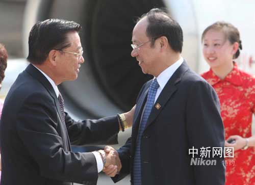 十一日下午三时十五分许,台湾海峡交流基金会董事长江丙坤率海基会代表团抵达北京首都机场,海协会常务副会长郑立中(右)到机场迎接江丙坤。作者:赵振清