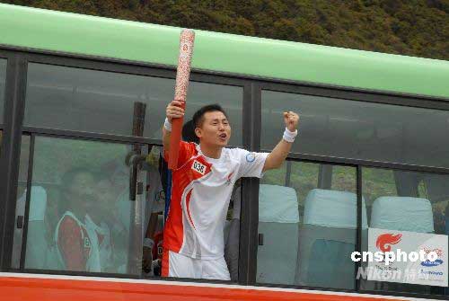 一位火炬手结束传递活动前往结束仪式途中,手举祥云火炬,高喊“中国加油”。中新社发 石雨 摄