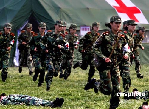 6月11日下午,中国人民解放军白求恩军医学院进行综合野外救治演练。演练过程模拟了灾害突发后,部分群众受伤休克、部分群众头部和下肢受伤,白求恩军医学院学员火速赶到现场实施生命救援。中新社发 宋吉河 摄