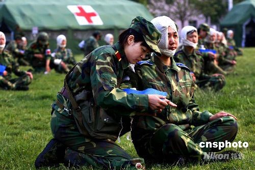 图为白求恩军医学院学员正在进行为伤员包扎演练。 中新社发 宋吉河 摄