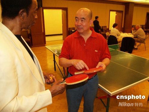 当地时间6月11日,庆祝“中美乒乓外交”37周年暨“迎接北京奥运”,中国驻洛杉矶总领馆特邀中国乒乓球队和美国乒乓球队到中领馆做客。图为30多年前的老对手中国队老将梁戈亮与美国队老将乔治,在美国重逢后格外亲热,并在一起交流球技。 中新社发 卢威 摄