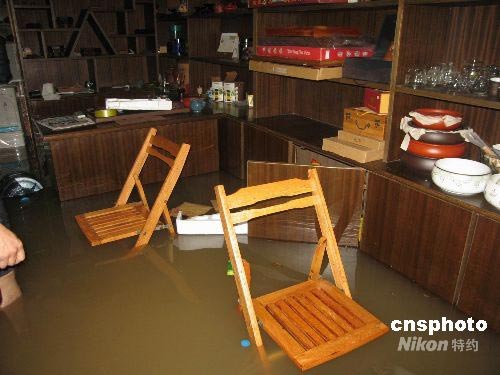 积水涌入居民家中和临街商铺,图为一家茶叶店“泡汤”。中新社发 周丹钰 摄