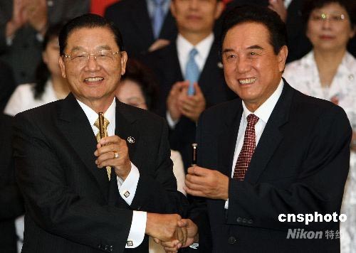 峡两岸关系协会会长陈云林(右)与台湾海峡交流基金会董事长江丙坤在签署“两岸周末包机”和“大陆居民赴台旅游”协议后,交换签字笔。中新社发 任晨鸣 摄