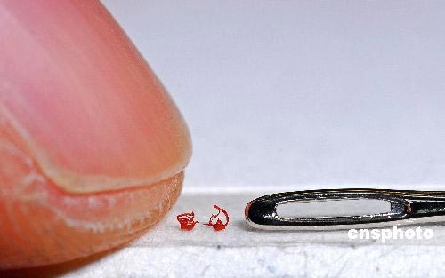 微雕大师用红翡翠石粉末雕刻的世界最小茶壶