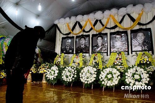 6月13日,四川大地震救援中失事直升机遇难机组人员遗体告别仪式在成都市殡仪馆举行,来自军方及社会各界的人士纷纷前来送别英雄。图为成都军区陆航团在凤凰山机场搭设灵堂,悼念在汶川大地震救灾行动中失事直升机上5位遇难机机组人员。中新社发 刘新 摄