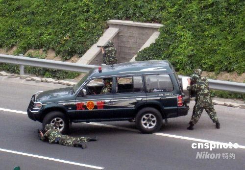 13日,中国“长城5号”国家级反恐怖演习科目之一的处置劫持人质事件,在人员入出境最频繁的北京首都国际机场附近进行。演习过程中,三辆运动员班车行至首都机场高速北线某桥面时,被两辆面包车阻停,“恐怖分子”将车上人员劫为人质。中新社发 于立霄 摄
