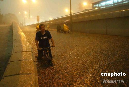 6月13日下午5时许,强雷阵雨突袭京城,北京市气象台发布了雷电黄色预警信号。 图为在北京一桥下积水路段,民众“河”中推车。中新社发 富田 摄