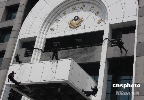 台北市政府警察局十三日举办庆祝警察节活动,安排安排平日难得一见的特勤中队表演战技操演,队员们全副武装直接从警察局十三楼楼顶一路攀降而下,这也是台北市警局大楼首次出现的高楼特警攀降表演。中新社发 耿军 摄