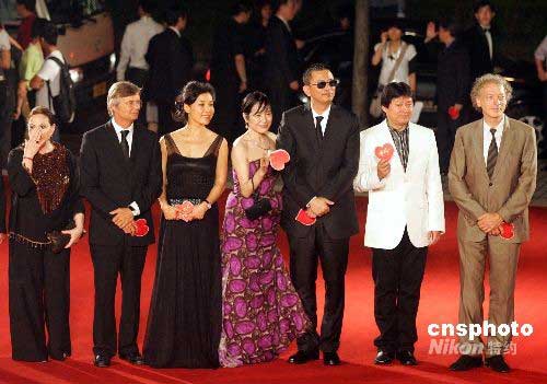 图为金爵奖国际评委亮相,他们是德国制片人乌里希、中国导演霍建起、中国香港导演王家卫、日本明星桃井熏、著名演员陈冲、丹麦导演比尔和以色列女演员吉拉(右起)。中新社发 潘索菲 摄