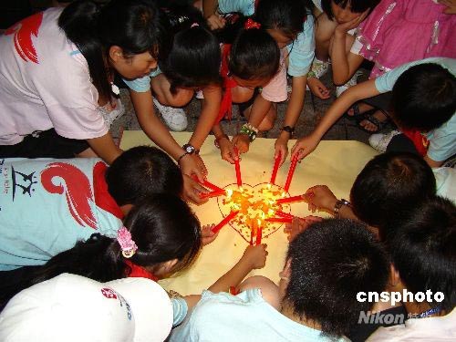 6月15日晚上,89名参加“爱心呵护、阳光行动”活动的在四川地震中的失亲孩子,用红色蜡烛油在白色的纸上作心型字,寄托对海南的眷恋和相思。16日他们将告别美丽的海南岛返回四川老家。中新社发 付美斌 摄