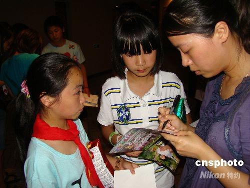 孩子们让在阳光活动中一直陪伴的阿姨签名。中新社发 付美斌 摄