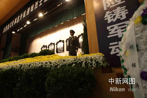 6月16日上午十时,成都军区隆重举行某集团军陆航团直升机组邱光华、李月、王怀远、陈林、张鹏5位烈士追悼会。5月31日,他们在执行运送受灾群众任务中,因高山峡谷局部气候瞬时变化、突遇低云大雾和强气流不幸失事而光荣牺牲。中华人民共和国中央军事委员会主席胡锦涛6月14日签署命令,授予他们所在的陆航团“抗震救灾英雄陆航团”荣誉称号。中新社记者 贾国荣 摄