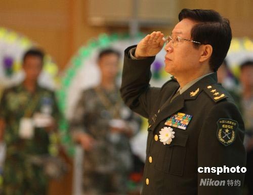 成都军区政委张海阳中将在追悼大会上向五位烈士敬礼。中新社发 贾国荣 摄
